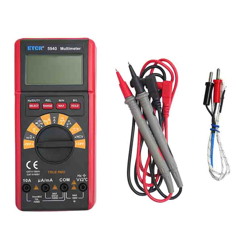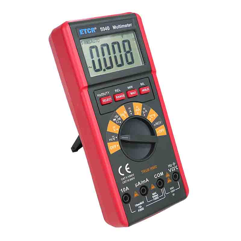 ETCR5940數(shù)字萬(wàn)用表又稱數(shù)字萬(wàn)能表、智能萬(wàn)用表,是一款3 5/6位便攜式自動(dòng)量程數(shù)字多用表,可測(cè)量交流電壓真有效值(TRMS)、直流電壓、交流電流真有效值(TRMS)、直流電流、電阻、頻率、溫度、電容、通斷測(cè)試、二極管正向壓降等。該儀表結(jié)構(gòu)精巧、操作容易、攜帶方便,是電工電子測(cè)量之理想工具。