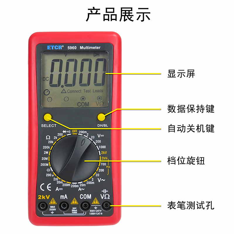 ETCR5960數(shù)字萬(wàn)用表又稱數(shù)字萬(wàn)能表、智能萬(wàn)用表,是一種性能穩(wěn)定、用電池供電的高可靠性數(shù)字萬(wàn)用表,它用單片機(jī)管理,全功能有過(guò)載保護(hù)。儀表能顯示各檔表筆和插座應(yīng)插的位置,提示您不要插錯(cuò)位置。該儀表能測(cè)量直流電壓和電流、交流真有效值電壓和電流、電阻、電容、二極管正向壓降、電路通斷等。測(cè)量準(zhǔn)確、性能穩(wěn)定、安全可靠,是您理想的測(cè)試維修工具!