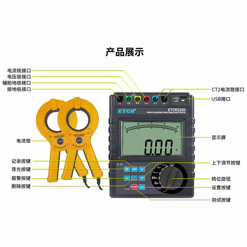 | ETCR3200C 雙鉗接地電阻測試儀 | Φ70mm | 0.00Ω~300kΩ | AC 0V~100V | 0.0mA~600A | 可設置報警閾值 | 2000組 |