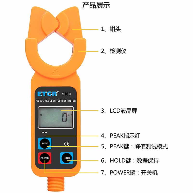 ETCR9000高低壓鉗形電流表鉗頭與引導(dǎo)區(qū)創(chuàng)新的一體化設(shè)計,通過按壓或退拔絕緣桿能快速方便鉗夾或撤離被測導(dǎo)線,安全快捷。儀表還具有峰值保持、數(shù)據(jù)保持、數(shù)據(jù)存儲等功能。