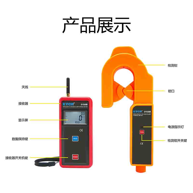 ETCR9150B無線高低壓鉗形電流表由鉗頭、接收器、絕緣桿組成,鉗頭與接收器無線通訊距離30m。鉗頭與引導區(qū)創(chuàng)新的一體化設計,通過按壓或退拔絕緣桿能快速方便鉗夾或撤離被測導線,安全快捷。儀表還具有數(shù)據(jù)保持、數(shù)據(jù)存儲等功能。