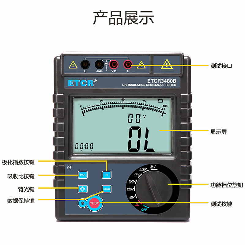 ETCR3480B絕緣電阻表又名兆歐表、絕緣電阻測(cè)試儀,用于絕緣電阻測(cè)試、吸收比、極化指數(shù)測(cè)試、交直流電壓測(cè)試。儀表具有LCD大屏幕帶背光顯示、數(shù)據(jù)保持、自動(dòng)放電、自動(dòng)關(guān)機(jī)等功能。儀表具有測(cè)試計(jì)時(shí),電壓監(jiān)測(cè)功能,回路電壓大于36V時(shí),儀表將禁止測(cè)試以保護(hù)被測(cè)物及人員安全。儀表功能操作簡(jiǎn)易,絕緣電阻值,測(cè)試時(shí)間,輸出電壓同屏顯示,具備交流電壓、直流電壓測(cè)試功能。