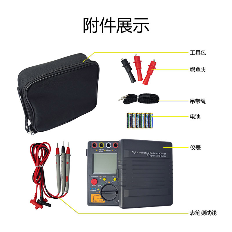 隨機(jī)附件 | 儀表:1件;高壓測(cè)試表筆:2條紅色; 表筆測(cè)試線:1條黑色;鱷魚夾:3個(gè)(紅色2個(gè)/黑色1個(gè)); LR6電池:6節(jié);工具包:1件 | |