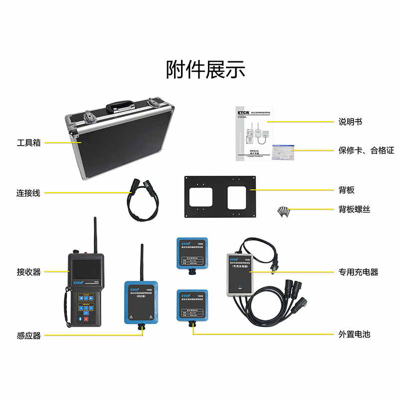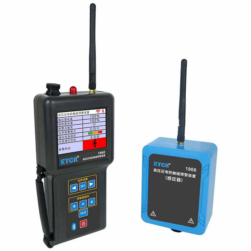 ETCR1900高壓近電防觸碰智能預警裝置由感應器、外置電池、接收器、藍牙APP組成。感應器采用非接觸感應技術用于監(jiān)測高壓電場,接收器接受感應器發(fā)送的監(jiān)測信號,當電場強度達到設定的報警值時,觸發(fā)報警功能發(fā)出聲光報警及語音報警。感應器與接收器采用無線通訊,傳輸距離200米。裝置具有報警靈敏度調節(jié)和邊界報警功能,用戶可在接收器設置報警靈敏度或自設定報警距離,以適應復雜電場的環(huán)境。接收器具有485接口及藍牙功能,便于用戶二次開發(fā)。移動終端安裝APP后,可查看報警信號或設置報警參數(shù)。