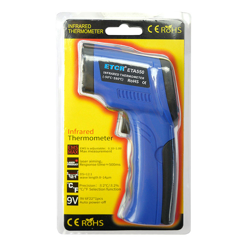 | ETA550非接觸式紅外測溫儀 | -50℃~550℃ | 0.1℃ | 8um~14um | 9V 碳性或堿性電池 |