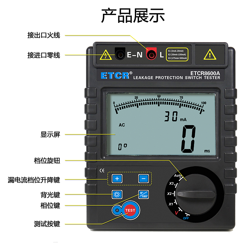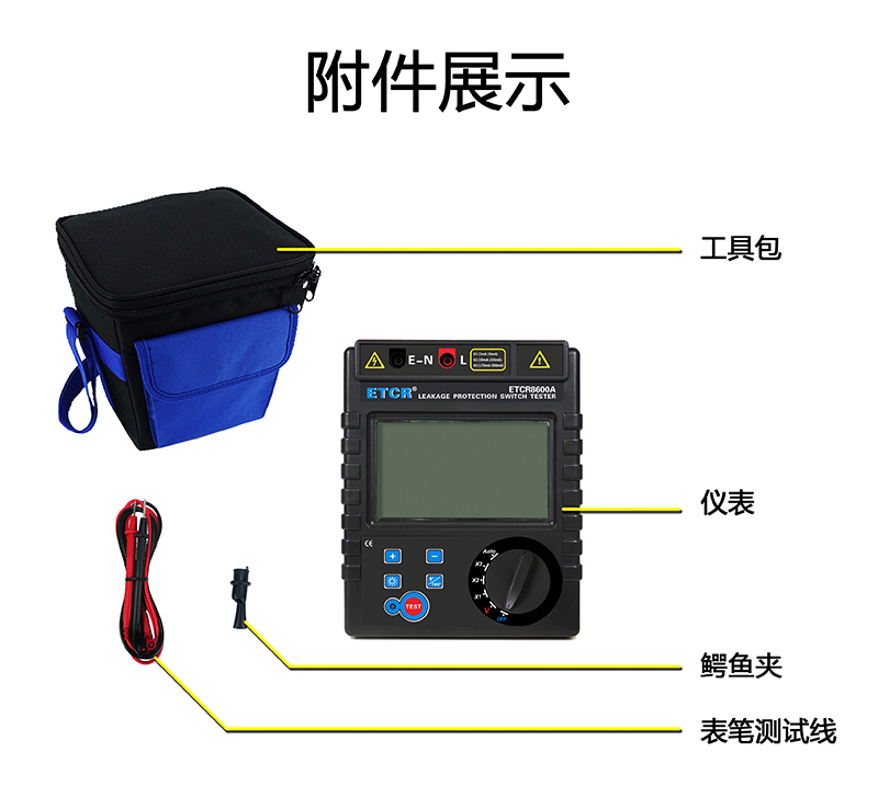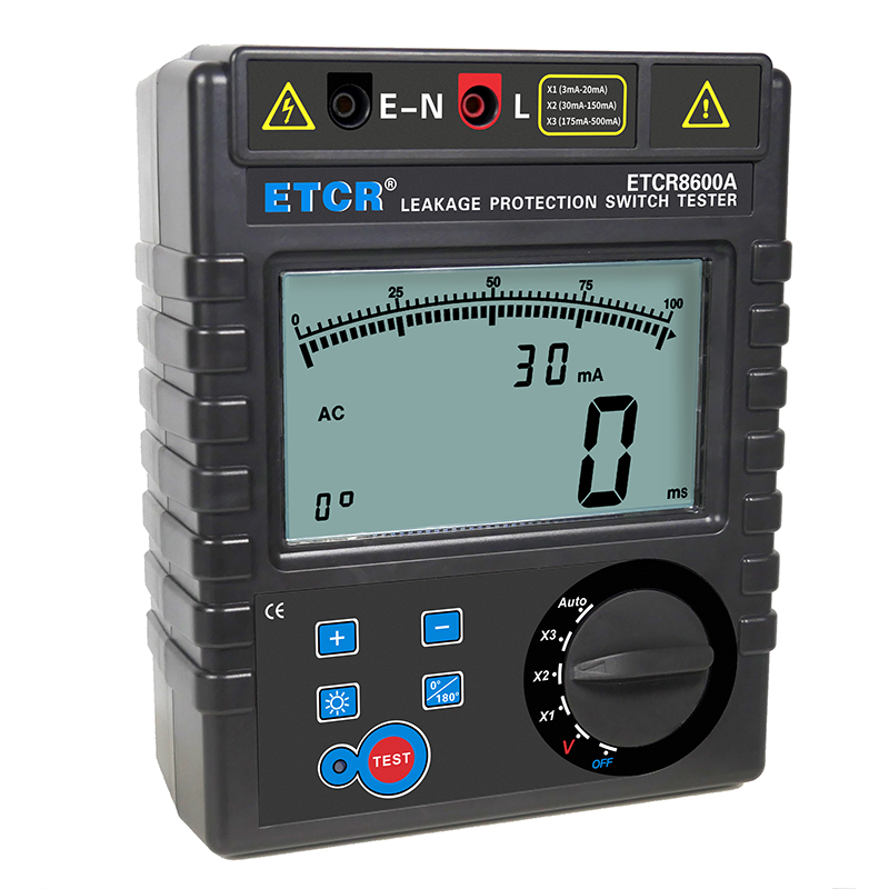 | ETCR8600A漏電保護(hù)器測(cè)試儀 | 3mA~500mA,十八檔 | 0ms~999ms | AC 0~600V | 大LCD屏 | 干電池 |