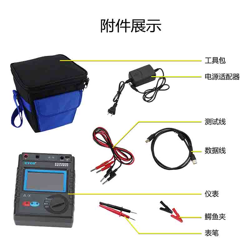 ETCR3800B智能型防雷元件測試儀采用觸摸彩屏中文界面,功能直達、一鍵測量、操作簡易快捷,用戶無需費力記憶操作方法,點擊屏幕的“HELP”即可彈出操作方法,有效指引用戶操作儀表。同時儀表采用大容量可充電鋰電池、具有數(shù)據(jù)存儲功能,可自動存儲含有日期時間的測試結(jié)果3000組、觸摸屏方便用戶查閱歷史記錄、USB數(shù)據(jù)上傳導(dǎo)出等功能,還有自動關(guān)機、電池電量低提醒等功能。
