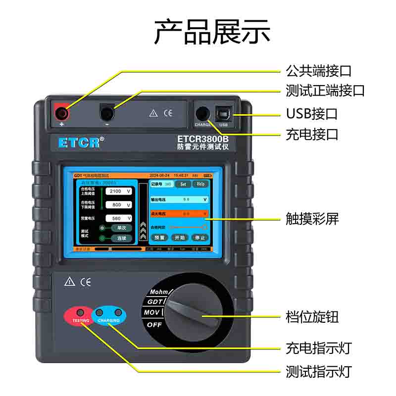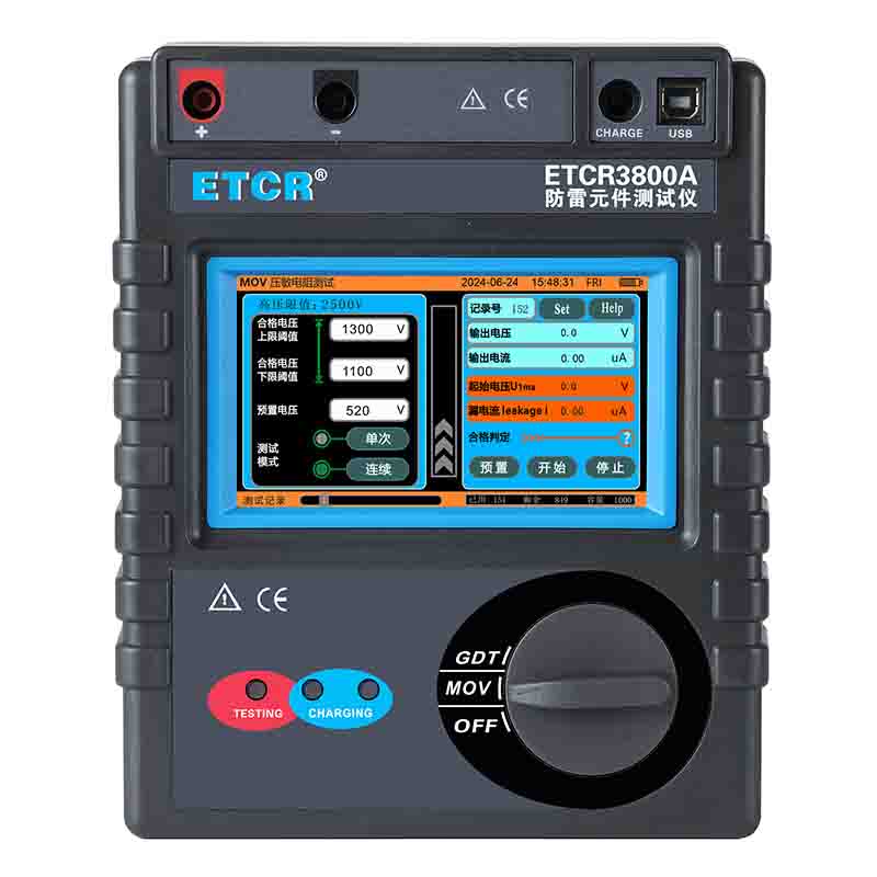 ETCR3800B智能型防雷元件測試儀又稱防雷元件測試表、SPD現(xiàn)場測試儀、壓敏電阻測試儀、浪涌保護器測試儀,用于測量各種壓敏電阻(MOV)、氣體放電管(GDT)、浪涌保護器(SPD)性能參數(shù)測試,還具有絕緣電阻、吸收比、極化指數(shù)測試功能。儀表具有獨特的高壓短路保護、過流保護功能,專業(yè)級的參數(shù)設(shè)置功能、高壓限值設(shè)定、升壓速度設(shè)定、合格范圍設(shè)定、合格判斷篩選、自動量程調(diào)節(jié)等功能。還具有單件測試模式、連續(xù)測試模式功能,特別適合批量元件測試。儀器廣泛用于避雷器、防雷器、浪涌保護器、壓敏電阻、金屬陶瓷放電管、真空避雷管等過壓防護元件性能參數(shù)的測試。是氣象防雷、電力、通信、機電安裝和維修、防雷元件生產(chǎn)廠家、以及工業(yè)企業(yè)部門常用必備的儀表。