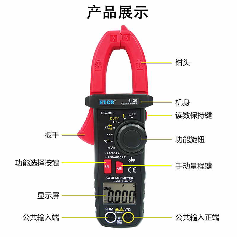 | ETCR6420鉗形萬(wàn)用表 | Ф27mm | DC 0mV~600V AC 0V~600V | 0A~600A | 0Ω~40MΩ | 0nF~10mF | 100Hz~40MHz | -50°C~1000°C |