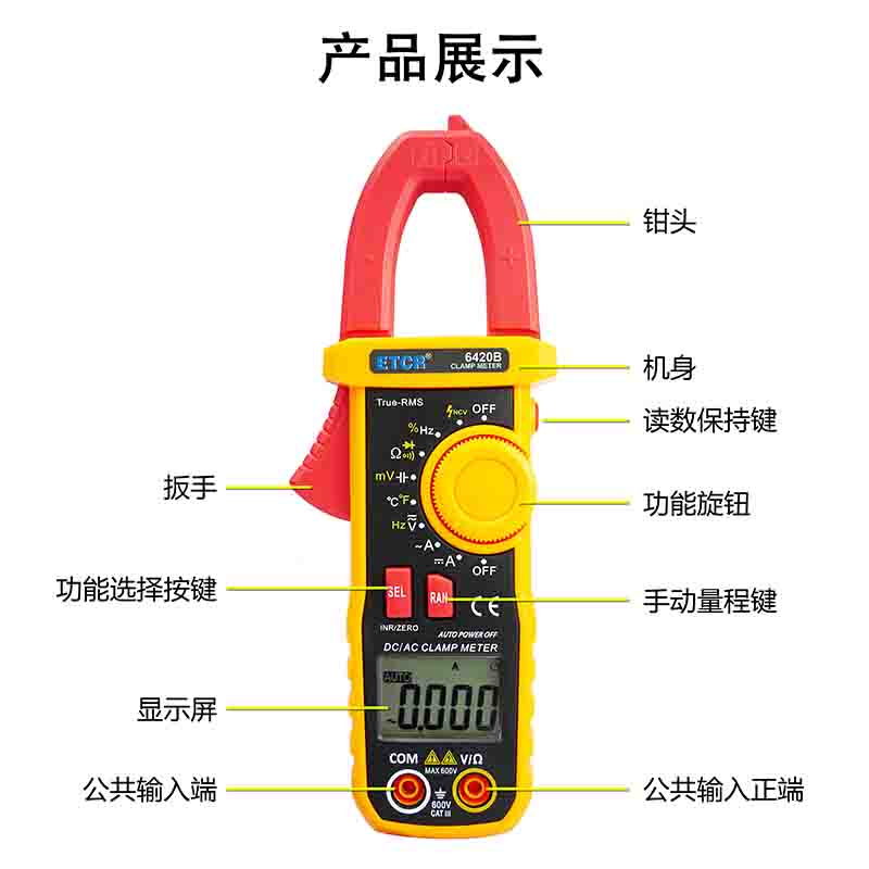 ETCR6420B鉗形萬(wàn)用表又稱多功能鉗形電流表,是一種便攜式鉗形數(shù)字多用表,可測(cè)量直流電壓、交流電壓電流真有效值、電阻、頻率、通斷測(cè)試、溫度、二極管正向壓降等參數(shù),電容測(cè)量量程擴(kuò)大到10mF且測(cè)量大電容速度快。該儀表結(jié)構(gòu)小巧、操作容易、攜帶方便,是電氣測(cè)量之理想工具。為用電檢查人員提供一種安全、準(zhǔn)確、便捷的新型電力儀表,是電工安全檢測(cè)的必備工具。