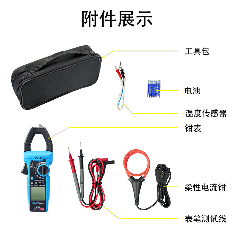 隨機(jī)附件 | 鉗表:1件;表筆:1套;溫度傳感器:1件;1.5V電池:3節(jié);工具包:1件 |