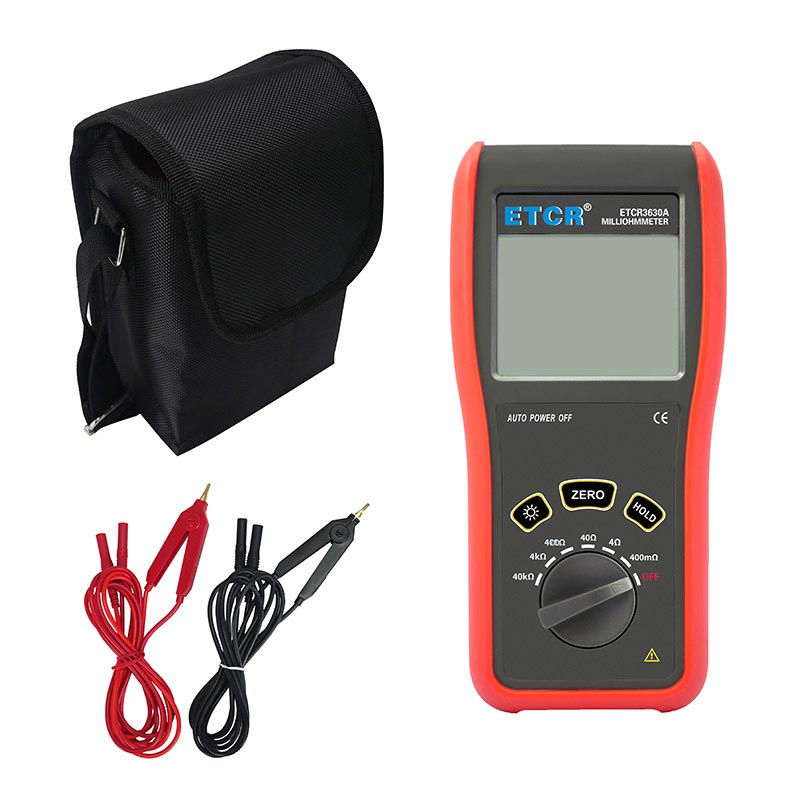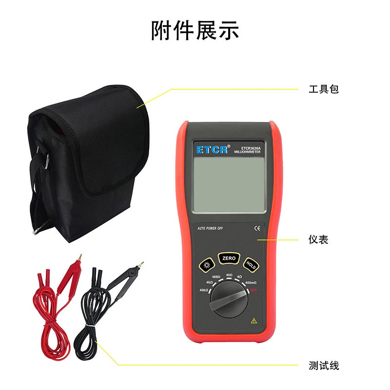 ETCR3630A便攜式毫歐計(jì)又稱直流低電阻計(jì)、直流電阻測(cè)試儀,歐姆計(jì),儀表采用微處理機(jī)技術(shù),四線法測(cè)試,安全精密可靠。主要用于測(cè)量電纜的導(dǎo)線電阻,開(kāi)關(guān)、接插件、繼電器的接觸電阻,線圈、電動(dòng)機(jī)、變壓器繞組的直流低電阻,金屬鉚接件金屬構(gòu)件之間,地網(wǎng)地極連接導(dǎo)體間的聯(lián)接電阻。儀表廣泛應(yīng)用于工礦企業(yè)、建筑監(jiān)測(cè)監(jiān)理公司、建筑施工單位、防雷公司、電力部門、船舶機(jī)車廠等。ETCR3630A便攜式毫歐計(jì)由主機(jī)、測(cè)試線組成。主機(jī)大屏LCD顯示,一目了然。能存儲(chǔ)1000組數(shù)據(jù),電阻測(cè)量范圍:0.1mΩ~40.0kΩ,最大測(cè)試電流:100mA,儀表操作簡(jiǎn)易,攜帶方便。