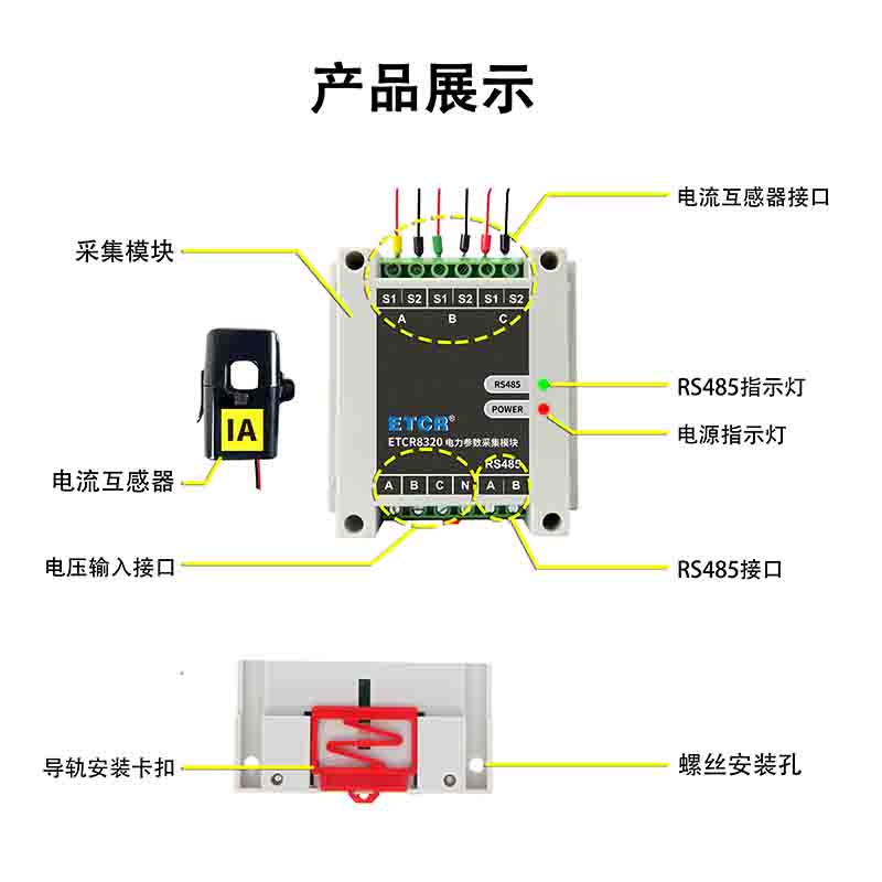 ETCR8320系列電力參數(shù)采集模塊用于現(xiàn)場(chǎng)在線實(shí)時(shí)監(jiān)測(cè)、記錄3路交流電流、交流電壓、無(wú)功功率、有功功率、視在功率、功率因數(shù)、畸變率、諧波、不平衡度、潮流方向等電力參數(shù)。采集模塊由采集器、開(kāi)口式互感器等組成。采集模塊可接入3路電流互感器、3路電壓。采集器具有RS485通訊功能,提供MODBUS通訊協(xié)議,便于用戶二次開(kāi)發(fā),B型具有PLC通訊?;ジ衅饔袌A形、扁口、防水型等多種款式可供用戶選擇,開(kāi)口式結(jié)構(gòu)CT現(xiàn)場(chǎng)安裝時(shí)無(wú)需停電無(wú)需斷開(kāi)電纜線,安裝方便安全。采集模塊體積小巧,特別適合安裝在JP柜、箱變電房等空間狹小的場(chǎng)所使用。采集模塊有2種安裝方式:螺釘安裝或?qū)к壈惭b。廣泛應(yīng)用在電氣裝置的交流電流、接地環(huán)流、交流電壓的在線監(jiān)測(cè),為用電檢查人員提供安全、準(zhǔn)確、便捷的電力參數(shù)。