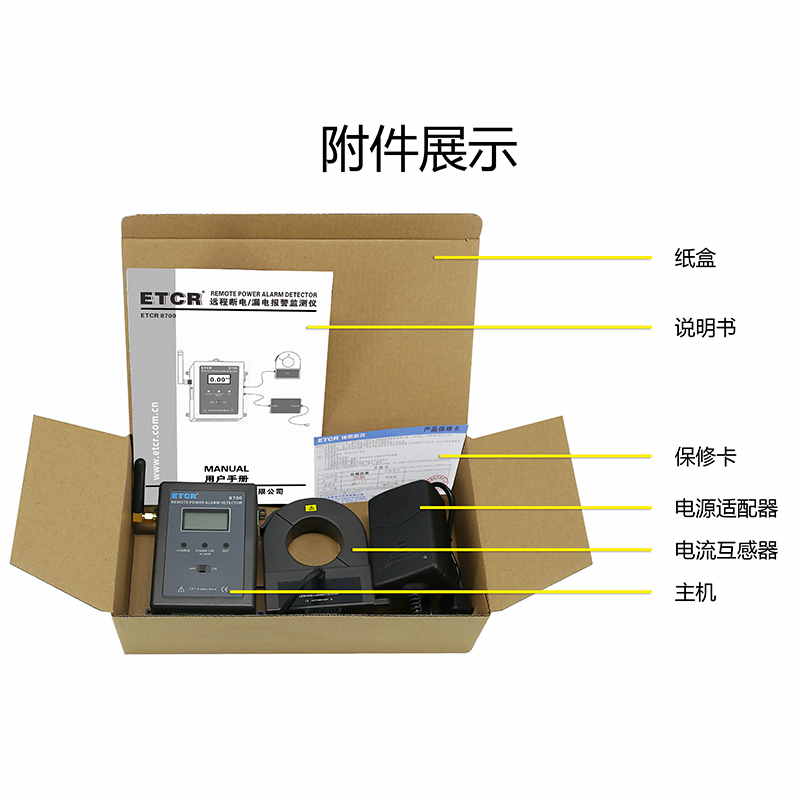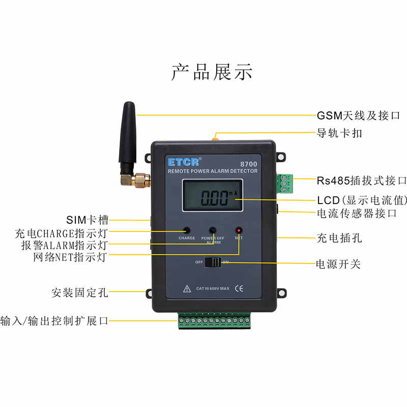 ETCR 8700遠(yuǎn)程斷電/漏電報(bào)警監(jiān)測儀又稱在線斷電報(bào)警器,用于需要無人值守和遠(yuǎn)程在線報(bào)警監(jiān)測斷電、恢復(fù)供電、漏電的工控現(xiàn)場,屬工業(yè)級(jí)4G報(bào)警監(jiān)控儀,也可以當(dāng)防盜報(bào)警器使用。監(jiān)測儀由電腦、電流傳感器、GPRS模塊、上位機(jī)軟件、電源適配器等組成。內(nèi)置GPRS模塊,用戶只需通過自己電腦服務(wù)器設(shè)置幾個(gè)簡單參數(shù),就可以隨時(shí)監(jiān)測遠(yuǎn)程設(shè)備是否斷電、是否恢復(fù)供電、是否有漏電等報(bào)警信息;也可以通過輸入擴(kuò)展口接入溫度、濕度、人體紅外感應(yīng)器等傳感器;還可以通過輸出擴(kuò)展口控制遠(yuǎn)程的繼電器等其他設(shè)備。廣泛適用于安防、電力設(shè)備、銀行、電信、工廠、鐵路、機(jī)房、不間斷電源、生物制藥、倉庫、藥房、重要機(jī)械設(shè)備、24小時(shí)運(yùn)轉(zhuǎn)的生產(chǎn)線等各種需要斷電報(bào)警、漏電監(jiān)測報(bào)警、遠(yuǎn)程控制啟停等場所。