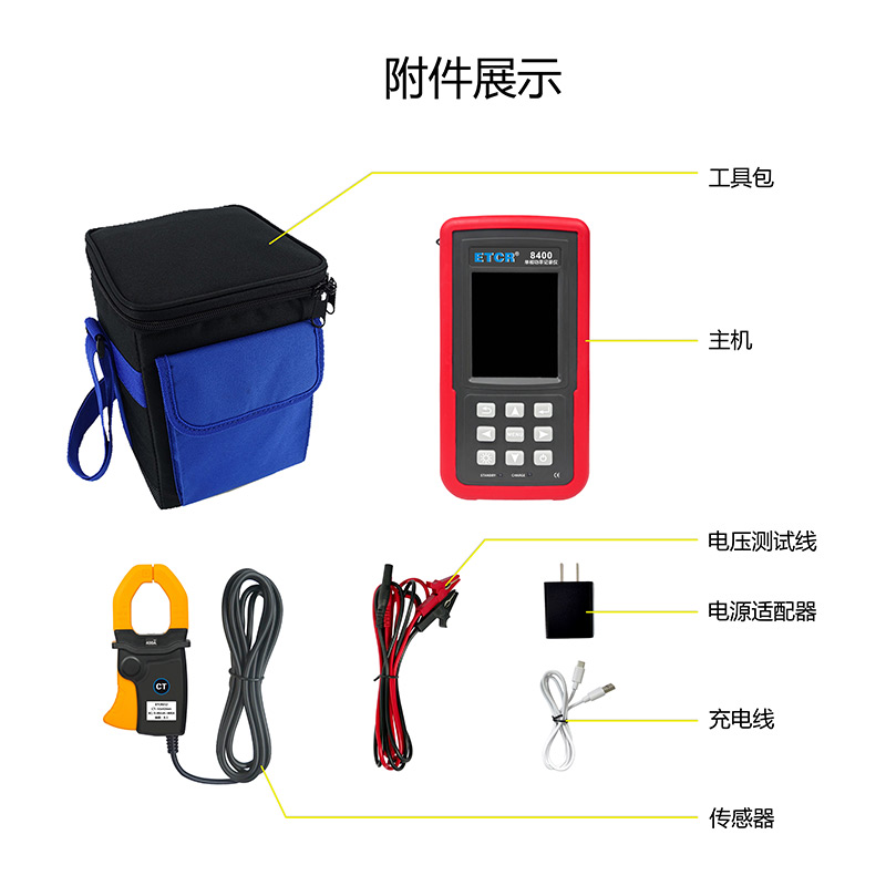 隨機(jī)附件 | 主機(jī)1件;互感器1個(ETCR8400)/3個(ETCR8430);電壓輸入線2條(ETCR8400)/4條(ETCR8430);數(shù)據(jù)線1個;電源適配器1個;工具包1件 |
