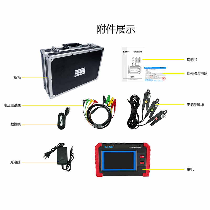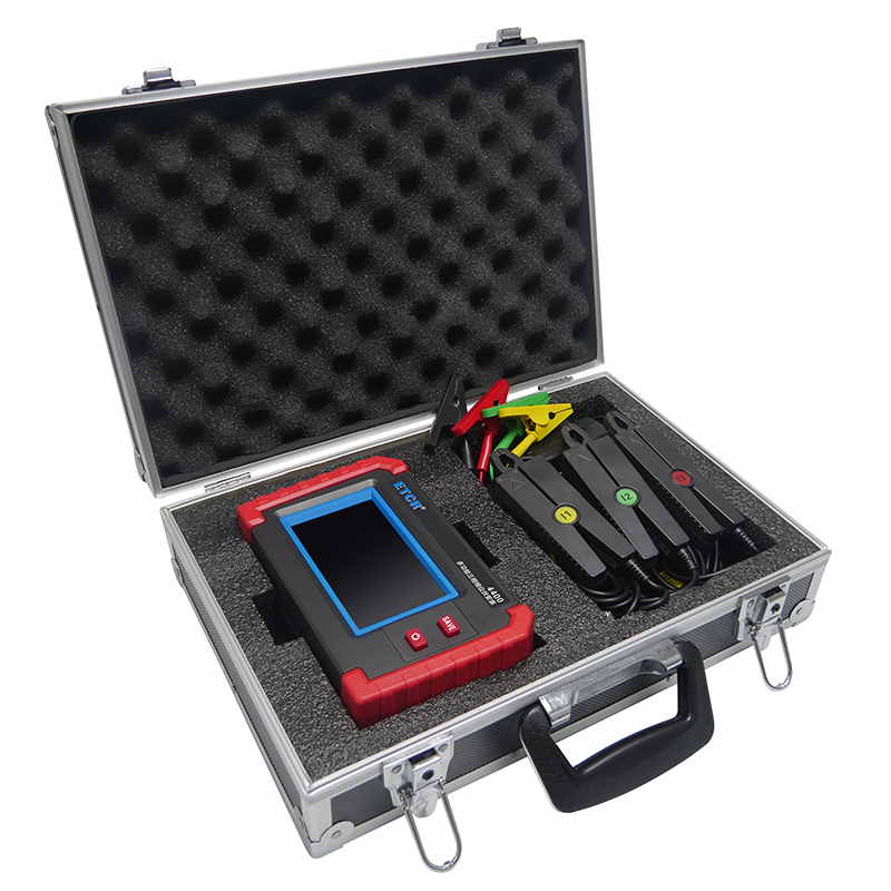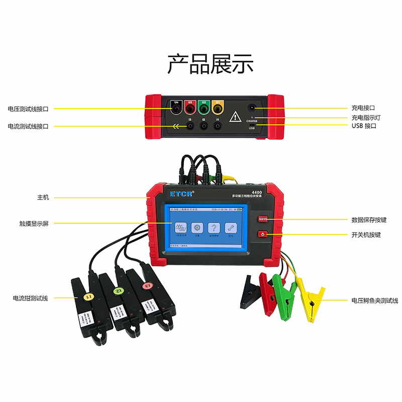 ETCR4400多功能三相相位伏安表由主機與電流鉗、電壓測試線組成。采用5寸觸摸彩屏、中文界面、功能直達、自動測量、操作簡易快捷,準確可靠,同時儀表采用大容量可充電鋰電池、具有數(shù)據(jù)存儲、數(shù)據(jù)查閱、自動關(guān)機、USB數(shù)據(jù)上傳導出等功能。由于本儀器采用專用計量芯片,所以本儀表具備非常高精度的電參數(shù)測量,能夠?qū)崟r顯示待測參數(shù)的變化,同時具備一鍵保存數(shù)據(jù)的功能。