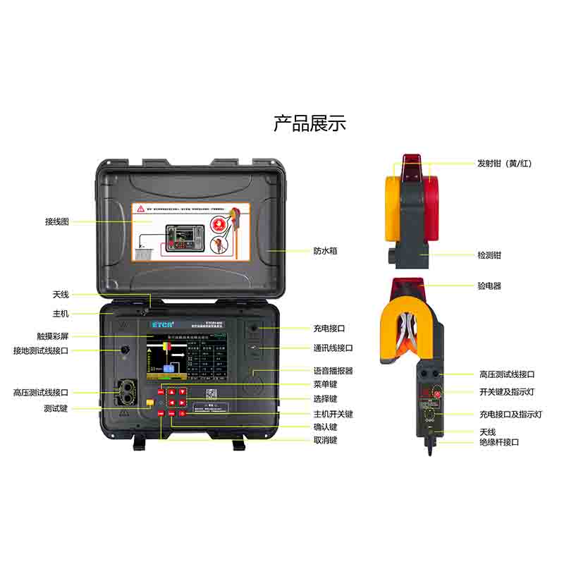 ETCR1400架空線路接地故障巡查儀又稱二分法架空線路接地故障查找儀、 架空線路單相接地故障定位儀、小電流接地故障定位儀、配網(wǎng)專用架空線路故障定位儀,儀器由主機、檢測鉗、測試線、接地針、絕緣桿及附件組成,主機與檢測鉗間采用無線通訊。主機采用7寸彩屏,故障指向清晰明了,測試結(jié)果一目了然,主機具有語音播報功能,語音提示線路故障方向,使得現(xiàn)場操作更加輕松。創(chuàng)新的檢測鉗集信號發(fā)射、采集于一體,鉗形結(jié)構(gòu),體積小,重量輕,掛裝方便,一次掛裝即可完成線路故障查找,操作簡易快速,極大減輕了測試的工作強度,提高工作效率。檢測鉗自帶非接觸驗電器,能檢驗電纜線是否帶電,并發(fā)出聲光報警,確保操作人員和設(shè)備的安全。儀器還具有藍牙通訊功能,USB通訊接口。
