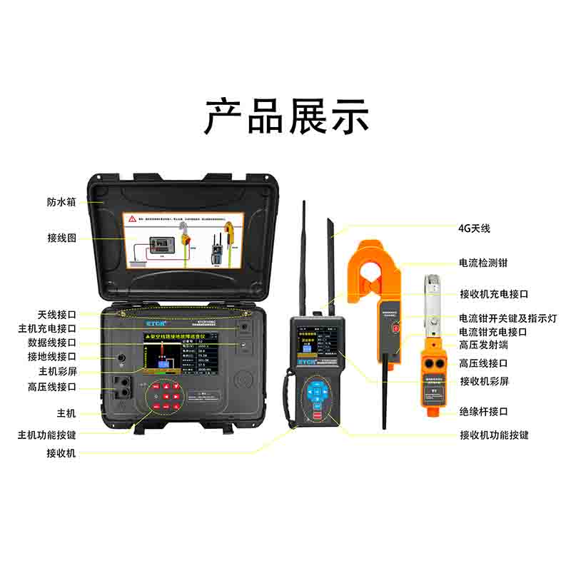 ETCR1400C架空線路接地故障巡查儀,由主機、電流檢測鉗、高壓發(fā)射端、接收機、測試線、接地針、絕緣桿及附件組成。主機與接收器之間為4G/LORA雙模通信,控制高壓信號輸出,同時將測試結果發(fā)出到主機。電流鉗與接收器之間為LORA通信,將電流鉗檢測到的信號發(fā)送到接收器。主機采用7寸彩屏,故障指向清晰明了,測試結果一目了然,接收機具有語音播報功能,測試結果、線路故障方向,使得現(xiàn)場操作更加輕松。電流檢測鉗及高壓發(fā)射端結構緊湊,體積小,重量輕,掛裝方便,一次掛裝即可完成線路故障查找,操作簡易快速,極大減輕了測試的工作強度,提高工作效率。