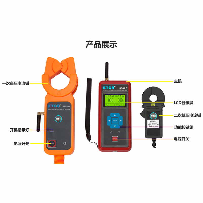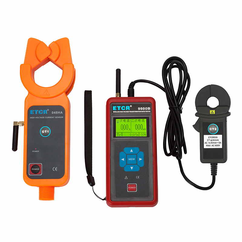 ETCR9500B無線高壓CT變比測試儀又稱互感器電流變比測試儀、互感器比差測試儀、電流互感器變比測試儀,用于35kV以下電流互感器的一次電流、二次電流大小、變比,相別、極性判斷。廣泛應(yīng)用于變電站﹑發(fā)電廠﹑電力稽查部門、工礦企業(yè)以及檢測站﹑電工維修部門進行電流檢測、反竊電及野外電工作業(yè)等。